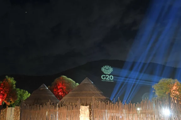 Featured image: G20 logo lit up hill over the G20 Sherpa Meetings in June 2025 | Credit: DIRCO G20 Flickr