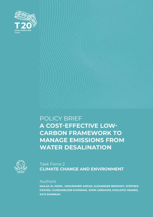This policy brief promotes renewable energy-powered water desalination with PVRO technology as a mechanism for creating an integrated and sustainable solution for both clean water production and energy storage. It presents the key technology, implementation, and replication-related interventions required to enable a costeffective low-carbon framework to manage emissions with water desalination. It aims to enable the G20 countries to realize higher levels of renewable energy integration in the energy mix and to realize major aspects of a circular economy.