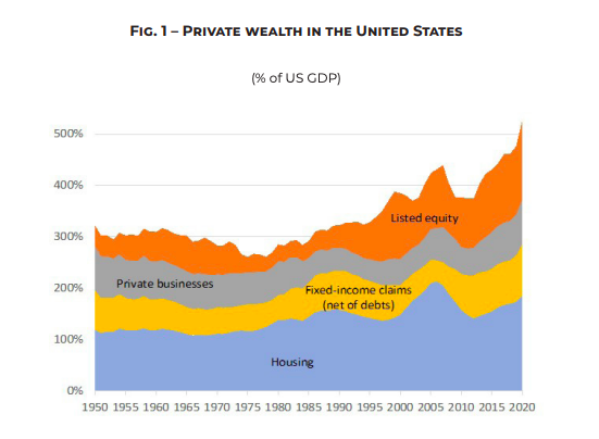 Notes: This figure shows the evolution of total private wealth in the United States, expressed as a fraction of GDP. Private wealth is the sum of the wealth of households and the wealth of non-profit institutions serving households. “Housing” includes both owner-occupied and tenant-occupied housing and is gross of any debt. “Fixed-income claims (net of debts)” includes all interest-generating assets (including those held through pension funds and insurance companies), net of all debts (mortgage and non-mortgage debt). “Private businesses” includes equity in non-corporate businesses (sole proprietorships and partnerships) and equity in unlisted corporate businesses (including S-corporations and private C-corporations). “Listed equity” includes household and non-profit equity in listed corporations, including equities held through pension plans and insurance companies. Source: Saez and Zucman (2016), updated, based on the Federal Reserve Financial Accounts.