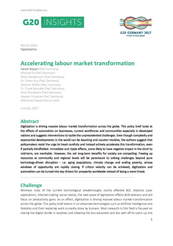 Digitization is driving massive labour market transformation across the globe. This policy brief looks at the effects of automation on businesses, current workforces and communities especially in developed nations and suggests interventions to tackle the unprecedented challenges. Even though complexity and exponential developments in the world can be daunting and counter-intuitive, the authors suggest that policymakers resist the urge to tread carefully and instead actively accelerate this transformation, even if partially blindfolded. Immediate and ripple effects, some likely to have negative impact in the short to mid-term, are inevitable. However, the net long-term benefits for society are compelling. Freeing up resources at community and regional levels will be paramount to solving challenges beyond pure technology-driven disruption – i.e. aging populations, climate change and ending poverty, whose windows of opportunity are rapidly closing. If critical velocity can be achieved, digitization and automation can be turned into key drivers for prosperity worldwide instead of being a mere threat.
