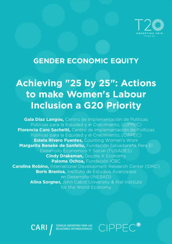 While women’s labour insertion has significantly increased, wide gender gaps persist: women partipate less in labour markets, their employment conditions are worse, they face glass walls and ceilings and they are discriminated by the law. Achieving gender equity is not only a moral imperative, but it also key for growth and development. The G20 countries have committed to reduce the gap in labour participation 25% by 2025, yet progress has been slim and thus innovative solutions need to be implemented. This document aims to provide policy recommendations to achieve this goal and bridge gender gaps in the world of work.