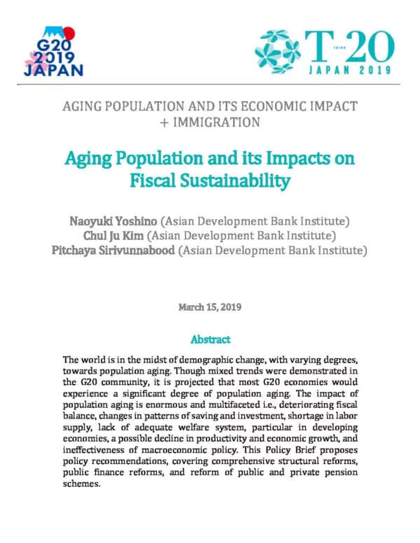 The world is in the midst of demographic change, with varying degrees, towards population aging. Though mixed trends were demonstrated in the G20 community, it is projected that most G20 economies would experience a significant degree of population aging. The impact of population aging is enormous and multifaceted i.e., deteriorating fiscal balance, changes in patterns of saving and investment, shortage in Labor supply, lack of adequate welfare system, particular in developing economies, a possible decline in productivity and economic growth, and ineffectiveness of macroeconomic policy. This Policy Brief proposes policy recommendations, covering comprehensive structural reforms, public finance reforms, and reform of public and private pension schemes.