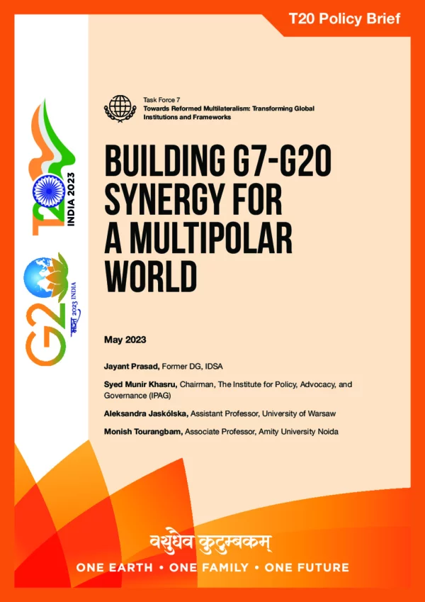 The world is currently in a period of transition towards multipolarity. This Policy Brief explores the importance of policy coordination between multilateral groupings with a focus on the G20 and G7, and argues that through institutional mechanisms, member countries can align their national strategies with a broader global vision. The G20 and G7 face common challenges, including achieving the Sustainable Development Goals (SDGs), energy transition, climate change, digital transformation, and the ongoing international financial crisis. The brief recommends that the G7 and G20 coordinate policies and initiatives in a manner that reboots multilateralism in the wake of fast-changing ground realities.