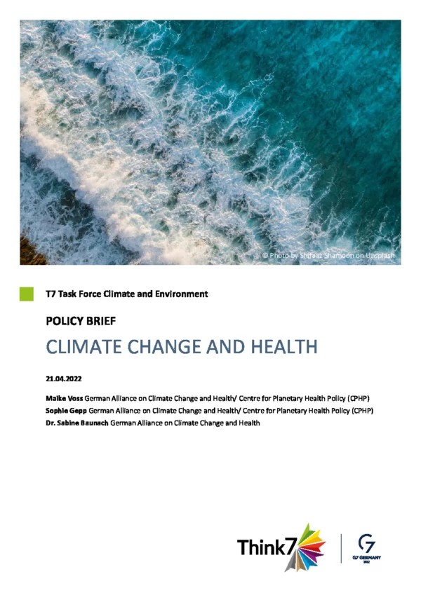 The effects of climate change, identified as the biggest threat to global health in the 21st century, are already affecting health and well-being adversely, and impacts will aggravate in the future with drastic outcomes. Therefore, the inclusion and discussion of climate change and health as a priority of the German G7 Presidency is urgently needed. The G7 have the unique opportunity to increase ambition and demonstrate leadership in this area and pave the way for the transition towards climate resilient and environmentally sustainable, climate-neutral health systems. To safeguard health in a changing climate and to prevent worse effects, investments in workforce training, integrated surveillance, monitoring and early-warning systems, and adaptable and resilient governance structures are needed. Additionally, more and robust financing mechanisms are necessary to mobilise resources to prevent, prepare for, detect and respond to climate change related health risks that will increase in the years to come. While adaptive measures are imperative to safeguard human health in the prevailing climate change, governance for cross-sectoral climate mitigation is the way to effectively tackle the root causes of climate change and its impact on health. In this policy brief, we recommend that the G7 lead the transition towards climate resilient and sustainable, climate-neutral health systems, building on existing initiatives such as the COP26 Health Programme and committing to transforming their own health systems, as well as supporting other countries – especially low and middle income countries (LMICs) – in this transformation. We recommend that the G7 invest in integrated climate change and health surveillance, monitoring, early-warning systems and joint strategic foresight. Moreover, capacity building and training of the current and future health workforce is needed. Finally, the G7 could promote integrated financing of climate action in the global health architecture.