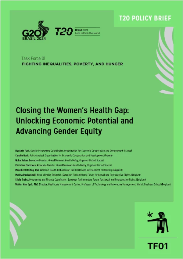 The women’s health gap is the result of decades of persistent disparities between women and men in terms of data, intervention efficacy, and care delivery. Growing evidence underscores that closing this gap not only benefits outcomes in the healthcare sector but also proves to be an effective strategy for achieving long-term prosperity, eradicating poverty, empowering women, and fostering social, political, and economic participation, thereby positively impacting many of the SDGs. Women currently spend 25% more of their lives in poorer health compared to men, signaling an urgent need for targeted interventions (World Economic Forum 2024). Additionally, closing the gender gap in labor markets could unlock a staggering $5.3 trillion in GDP (International Labor Organization 2017). Despite the substantial economic returns and the knowledge that women’s health is fundamental to advancing gender equity, only 4% of investments in health specifically target women’s health (World Economic Forum 2023). This policy brief elevates the crosscutting impact of maternal, sexual, and reproductive health, outlines actionable recommendations, and offers a roadmap for G20 leaders to set forth a focused global agenda on women’s health to accelerate change and reduce inequality at the local, national, and international levels. Recommendations feature new research assessing the extent to which investments in family planning technology and services contribute to reducing the gender pay gap. Integrated findings from relevant projects and new assessment tools like the Global Contraception Policy Atlas, help to create a comprehensive review that contextualizes equality-enhancing family planning policies within a G20 framework, contributing to a better understanding of the impact of investing in women’s health and family planning in accelerating achievement of the SDGs, providing valuable insights for policymakers to design and implement effective strategies.