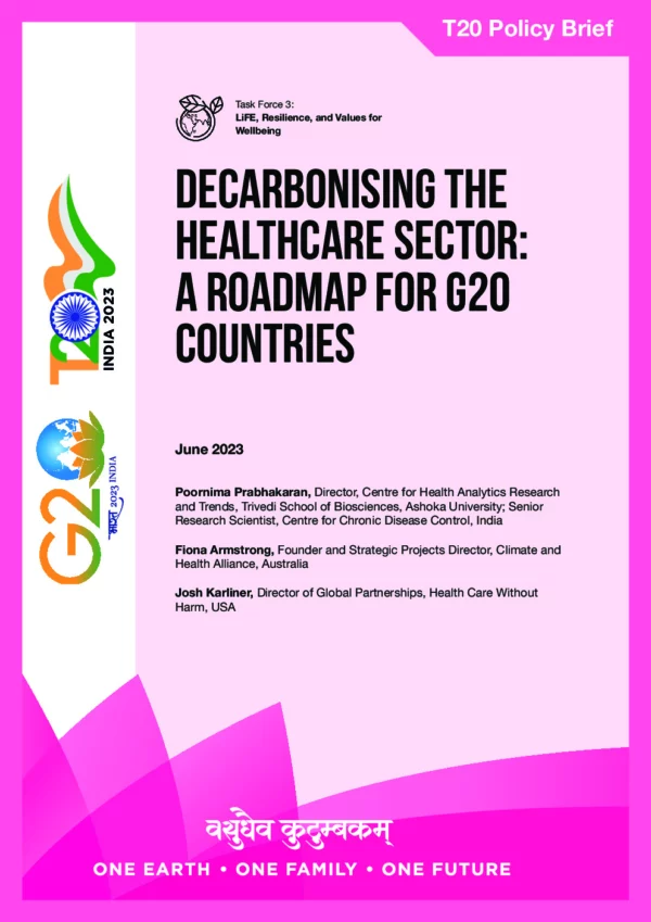 The climate crisis is at its core a public health crisis. Timely, appropriate and comprehensive response by all nations is imperative to prevent economic and social crises associated with the growing burden of climate impacts on human health and health systems. To deliver quality healthcare, health facilities – infrastructure and supply chains – must be structurally and functionally resilient. They should neither contribute to climate change nor be impacted by it. The health workforce should be prepared for and capable of responding to climate risks and impacts. Healthcare facilities collectively contribute nearly 5 percent of global greenhouse gas (GHG) emissions, 71 percent of it coming from the supply chain.1 To align itself to the goals of the 2015 Paris Agreement, the health sector must also decarbonise. This Policy Brief recommends that G20 countries adopt the steps outlined in the ‘Global Roadmap for Health Care Decarbonisation’2 of the global NGO Health Care Without Harm to secure public health and achieve net-zero healthcare.