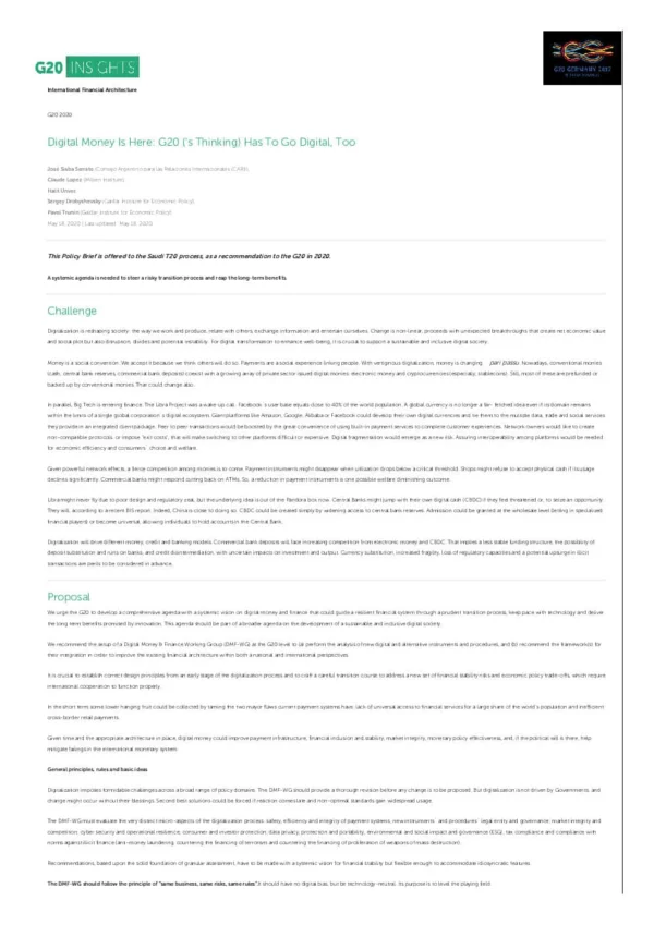 We urge the G20 to develop a comprehensive agenda with a systemic vision on digital money and finance that could guide a resilient financial system through a prudent transition process, keep pace with technology and deliver the long term benefits promised by innovation. This agenda should be part of a broader agenda on the development of a sustainable and inclusive digital society.