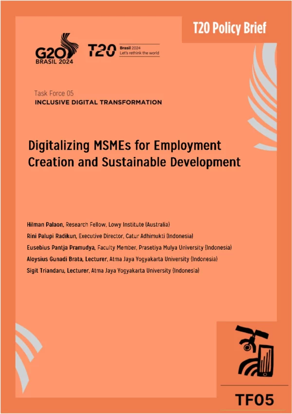 This policy brief focuses on digitalizing Micro, Small, and Medium Enterprises (MSMEs) in Indonesia. It explores how MSMEs can contribute to SDGs while ensuring decent work opportunities. In Indonesia, where MSMEs contribute significantly – 61% to the GDP and 97% to employment – this brief underscores their indispensable role as economic pillars. This policy brief delves into crucial aspects of MSMEs’ digital transformation, including digitalization, e-commerce, cybersecurity, and the digital divide. Specifically, it explores the challenges and opportunities presented by these areas and proposes recommendations to enhance digital capabilities. The brief introduces the MSMEs digitalization framework as a strategic roadmap, offering lessons for other countries. The recommendations aim to inspire collaborative efforts among G20 nations to support global MSMEs digitalization, fostering economic growth, reducing inequalities, and advancing sustainable development.