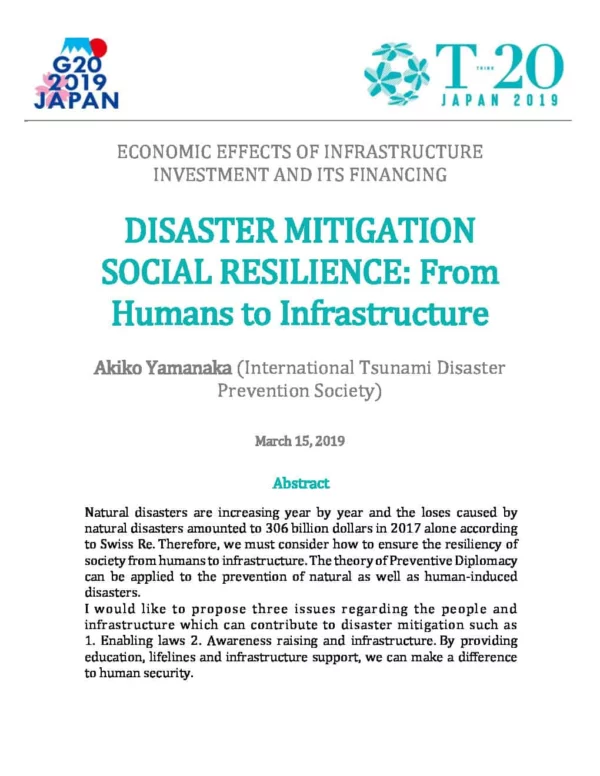 Natural disasters are increasing year by year and the loses caused by natural disasters amounted to 306 billion dollars in 2017 alone according to Swiss Re. Therefore, we must consider how to ensure the resiliency of society from humans to infrastructure. The theory of Preventive Diplomacy can be applied to the prevention of natural as well as human induced disasters. I would like to propose three issues regarding the people and infrastructure which can contribute to disaster mitigation such as 1. Enabling laws 2. Awareness raising and infrastructure. By providing education, lifelines and infrastructure support, we can make a difference to human security.