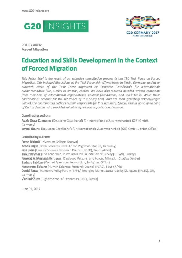 This Policy Brief is the result of an extensive consultation process in the T20 Task Force on Forced Migration. This included discussions at the Task Force kick-off workshop in Berlin, Germany, and at an outreach event of the Task Force organized by Deutsche Gesellschaft für Internationale Zusammenarbeit (GIZ) GmbH in Amman, Jordan. We have also received detailed written comments from members of international organizations, political foundations, and think tanks. While these contributions account for the substance of this policy brief (and are most gratefully acknowledged), the coordinating authors Astrid Skala-Kuhmann (GIZ GmbH) and Ismael Nouns (GIZ GmbH) remain responsible for this summary. Special thanks go to Anna Lang (Education Consultant), who provided valuable expert and organizational support.
