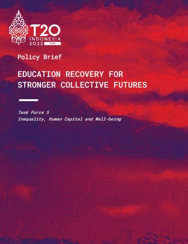 Years of progress on United Nations Sustainable Development Goal (SDG) 4 are under threat of reversal. Globally, we estimate an average total loss of 10.3 months due to school closures. The scale and scope of education disruption jeopardises our collective futures. Simultaneously, we are experiencing significant social, economic and political shifts. Group of 20 (G20) members are not immune. This brief presents five recommendations to G20 members and G20 Organisation for Economic Co-operation and Development (OECD) Development Assistance Committee (DAC) donors from the perspective of education as a “common good”, moving beyond the utilitarian functions of education. Recommendations are based on an equity-focused crisis-sensitive approach for inclusive and resilient education systems for recovery to build stronger collective futures.