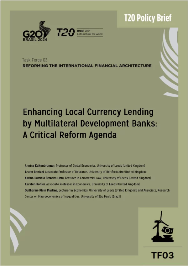 This policy brief highlights the crucial role of local currency lending by Multilateral Development Banks (MDBs) in achieving the Sustainable Development Goals (SDGs), particularly in low- and middle-income countries (LMICs). While current policy discussions emphasise the need to increase MDBs’ lending capacity, this alone may not ensure sustainable lending practices. It is vital to provide financing that aligns with recipients’ absorptive capacity and minimises macroeconomic vulnerabilities. A key aspect of this discussion is the currency denomination of financing arrangements, which has gained attention in policy agendas such as the Bridgetown Initiative. This framework stresses the need to avoid currency mismatches that could exacerbate debt crises in LMICs. Despite growing consensus on the need to increase local currency lending by MDBs, there remains a significant gap in systematic analysis and understanding of these practices. This brief aims to bridge the gap by discussing the advantages of borrowing in local currency and analysing the reasons for MDBs’ reluctance to lend in these terms. The central argument is that the risks associated with local currency lending are often overestimated, resulting in insufficient financing. This overestimation stems from perceived risks in LMICs, which drive up the costs of risk management, particularly for exchange rate risk. Moreover, local currency lending could unlock untapped opportunities and benefits for MDBs. We offer several policy recommendations to the G20 to enhance MDBs’ capacity to lend in local currency. These include scaling up and improving methods for hedging currency risks, facilitating local currency funding in onshore markets, and reforming risk management frameworks. Additionally, we advocate for integrating local currency lending into the core of the developmental mandate of MDBs and strengthening the technical assistance provided by these institutions to support these efforts.