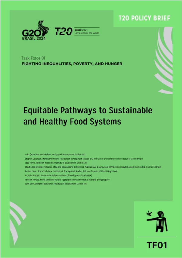 Ensuring pathways to sustainable food systems are equitable is a moral and existential imperative. Food systems are sustainable when they promote responsible use of natural resources, protect biodiversity, and mitigate the environmental impact of production, distribution, and consumption. They are equitable when they create a just and inclusive environment where everyone can enjoy healthy and sustainably produced food. Equity and sustainability are deeply intertwined and cannot be dealt with separately. This Policy Brief offers a roadmap to equitable and sustainable food systems that draws on a body of work produced by an international network of researchers, via their partnership in the Food Equity Centre. It recommends action at local, national, and international levels that addresses four dimensions of justice: (1) recognition and support of groups marginalised from different aspects of food systems; (2) their meaningful representation in decision- making processes and spaces (3) redistribution of resources and opportunities to rebalance and restructure food systems, and (4) reparation of harm caused to people and nature, by restoring biological and socio-cultural diversity. The time is right for the G20 to champion the food system transformation required to address the dual challenges of equity and sustainability.