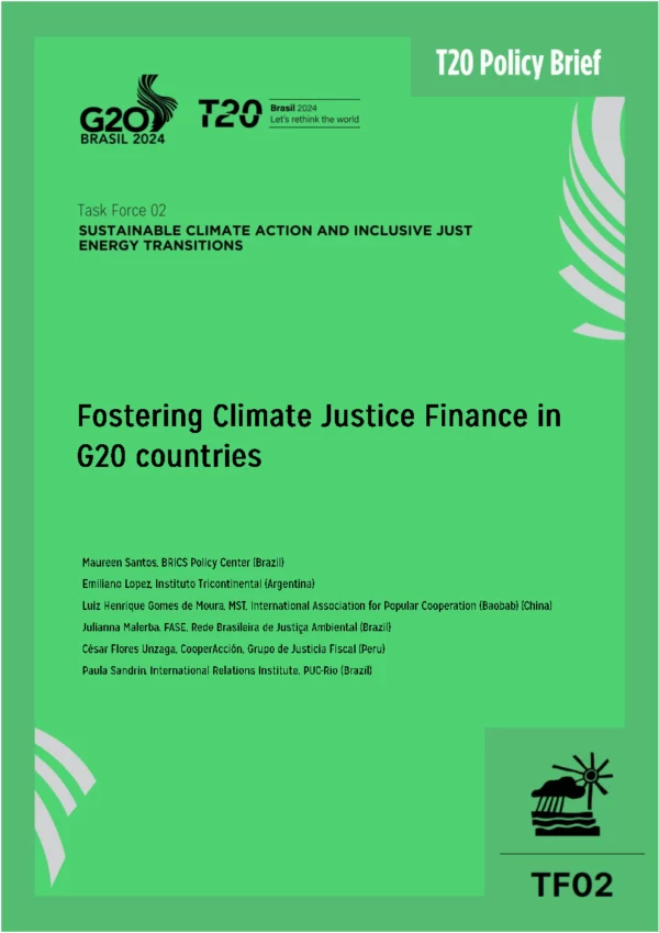 The basic tenets of climate justice involve recognizing that the impacts of climate change, while affecting the entire world, manifest in varying degrees and intensities across countries and social groups. Those least responsible for the climate crisis are potentially the most adversely affected, whether by the impacts themselves or by the climate-related solutions. Achieving climate justice remains one of the foremost challenges and, to operationalize it, there is a significant need to propose strategic policies and measures ensuring access to funding and socio-environmentally just technology transfer. This policy brief addresses the imperative of fostering climate justice by proposing the incorporation of reparative and redistributive mechanisms into climate financing, providing territorial-based innovations with high replicability. Reparation recognizes historical injustices and aims to rectify past environmental exploitation, providing a more just and sustainable future. Simultaneously, redistribution ensures that climate finance benefits are equitably distributed, benefitting marginalized communities and nations. The approach presented not only targets global climate action (SDG 13) but also aligns with reducing inequalities (SDG 10) and protecting life on land (SDG 15). The debate surrounding fair global taxes and community-led climate funds serves as pivotal aspects of these recommendations. The promotion of fair taxation systems can support funds in ways that consider historical environmental impacts and strive to rectify systemic inequalities. The consolidation of a new global financial architecture through the G20 must be guided by a progressive elimination of fossil fuels (SDG 7). By embracing these concepts, this comprehensive approach argues for creating a transformative and inclusive framework for combating climate change while promoting climate justice finance in G20 countries.