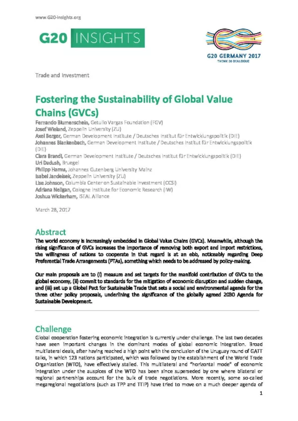 Our main proposals are to (i) measure and set targets for the manifold contribution of GVCs to the global economy, (ii) commit to standards for the mitigation of economic disruption and sudden change, and (iii) set up a Global Pact for Sustainable Trade that sets a social and environmental agenda for the three other policy proposals, underlining the significance of the globally agreed 2030 Agenda for Sustainable Development.
