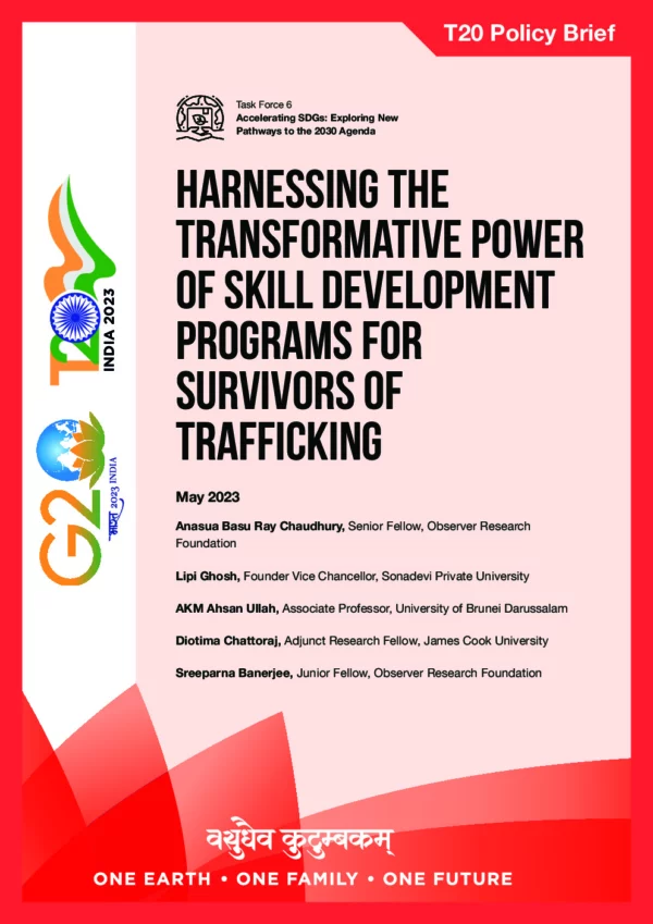In 2017, the G20 pledged to implement immediate and effective measures to eliminate forced labour, human trafficking, and other forms of modern-day slavery. Such declaration of commitment is impactful, given the G20’s economic and political heft. This Policy Brief focuses on how the G20 can lead efforts to put survivors of human trafficking back in society’s mainstream. To prevent survivors from being re-trafficked and help them establish a foothold in resuming their lives, it is crucial to provide them with market-relevant skills training that would allow them to find reliable sources of income. Building upon case studies of skill development programmes being implemented by both governments and non-government organisations in developing countries in South and Southeast Asia, this Policy Brief outlines recommendations for the G20 to facilitate the promotion of these initiatives.