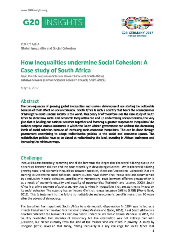 The consequences of growing global inequalities and uneven development are starting be noticeable because of their effect on social cohesion. South Africa is such a country that bears the consequences of having the most unequal society in the world. This policy brief therefore uses the case study of South Africa to show how social and economic inequalities can end up undermining social cohesion, the very glue that is holding our national societies together and fostering a greater response to inequalities.The authors propose various measures in which the South African government can address the decreasing levels of social cohesion because of increasing socio-economic inequalities. This can be done through government committing to adopt redistributive policies in the social and economic spaces. The redistributive policies have to be aimed at redistributing the land, investing in African businesses and increasing the minimum wage.