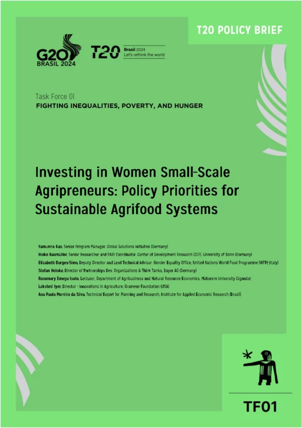 Without women, global agriculture would collapse. Ecosystem and structural barriers impede women small-scale agripreneurs’ access to capital, assets, products, services, and information needed for agricultural production and other agribusinesses (Lecoutere, et al. 2023). Women are also more likely to be in precarious forms of employment, including unpaid family labour, informal sector or casual wage roles, and bear almost three times more household-related burdens. Social norms and structural barriers limiting the equitable economic participation of women in agrifood systems result in women and girls being disproportionately affected by the impacts of climate change, deepening their risk of food insecurity and worsening their income generation capacity. Existing laws and social norms alongside deeply entrenched customary, economic, and political structural barriers prevent women small-scale agripreneurs from being effectively represented in decision-making and leadership roles. This needs to change. Closing the gender gap in agriculture would add nearly USD 1 trillion to the global economy, and 45 million fewer people would be at risk of food insecurity (FAO 2023). It is not the lack of policy proposals but the mismatch between proposals and action that has hampered progress. This policy brief will examine the specific barriers to women agripreneurs’ participation in the agrifood sector. The paper recommends that the G20 adopts a mix of gender-responsive policy interventions: (i) capacity building initiatives for women agripreneurs to expand their access to information, finance, land, inputs, and assets to enhance productive, processing, and marketing capacity, (ii) creating a permanent representative Working Group that supports policies and actions for small-scale women agripreneurs, and (ii1) establishing a G20 Dashboard on gender equality outcomes that incorporates accountability mechanisms, reviews progress and proposes next steps to further invest in women in agrifood systems.