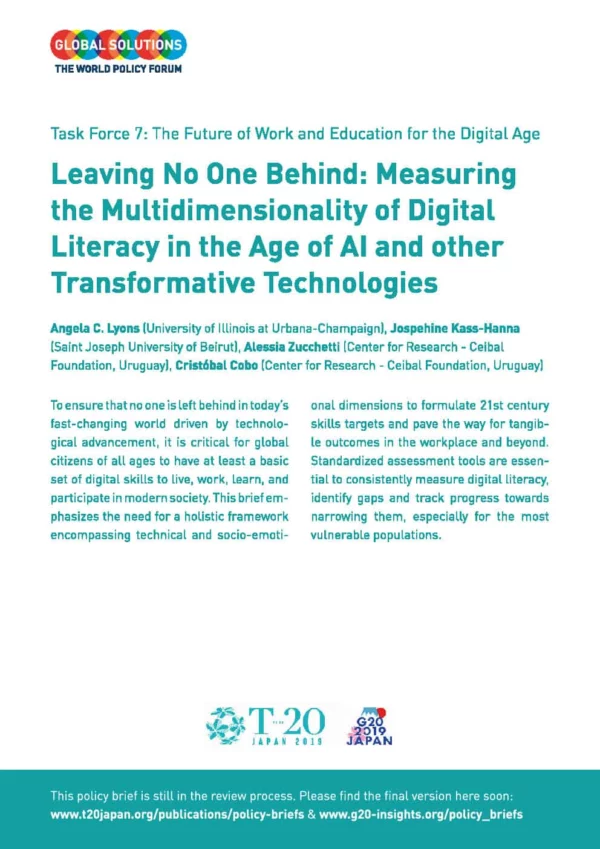 The current policy brief addresses the multidimensionality of digital literacy and e-inclusion in light of the challenges that transformative technologies are creating for the future of work worldwide. In particular, it stresses the need to introduce comprehensive and holistic frameworks for defining, measuring and assessing digital literacy, which reflect the complex set of skills needed for creating tangible outcomes in the work environment and beyond. The G20 is well positioned to lead this process of developing comprehensive definitions, strategies and assessment tools for measuring digital literacy. These efforts would include the diverse set of skills – technical and non-technical – that are and will be needed in the future.