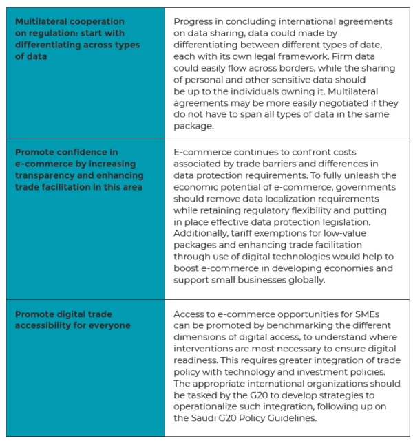 Ongoing World Trade Organization (WTO) negotiations on e-commerce and WTO agreements on trade in services and trade facilitation provide a basis for defining a set of common, agreed principles. G20 member states can give new impetus to e-commerce by agreeing to facilitate cross-border data flows, removing policies that discriminate against small firms and small consignments, and launching initiatives to support the inclusion of innovative small and medium enterprises (SMEs) in global digital trade markets.