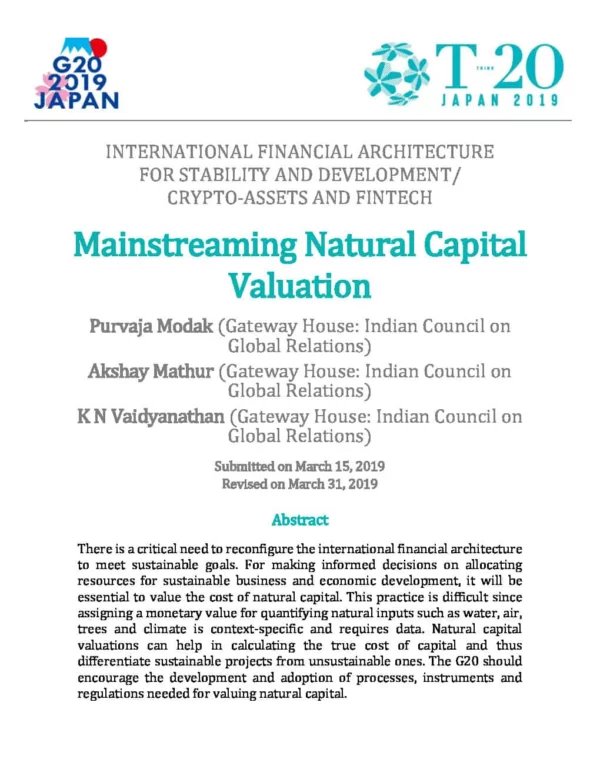 There is a critical need to reconfigure the international financial architecture to meet sustainable goals. For making informed decisions on allocating resources for sustainable business and economic development, it will be essential to value the cost of natural capital. This practice is difficult since assigning a monetary value for quantifying natural inputs such as water, air, trees is context-specific and requires data. Natural capital valuations can further help in calculating the true cost of capital and thus differentiate sustainable projects from unsustainable ones. The G20 should encourage the development and adoption of processes, instruments and regulations needed for valuing natural capital.