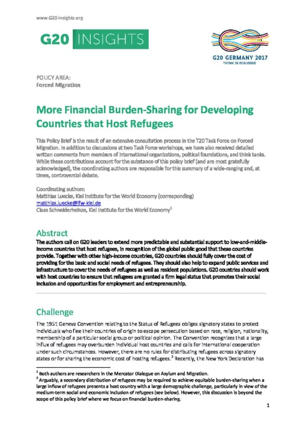 This Policy Brief is the result of an extensive consultation process in the T20 Task Force on Forced Migration. In addition to discussions at two Task Force workshops, we have also received detailed written comments from members of international organizations, political foundations, and think tanks. While these contributions account for the substance of this policy brief (and are most gratefully acknowledged), the coordinating authors [1] remain responsible for this summary of a wide-ranging and, at times, controversial debate.