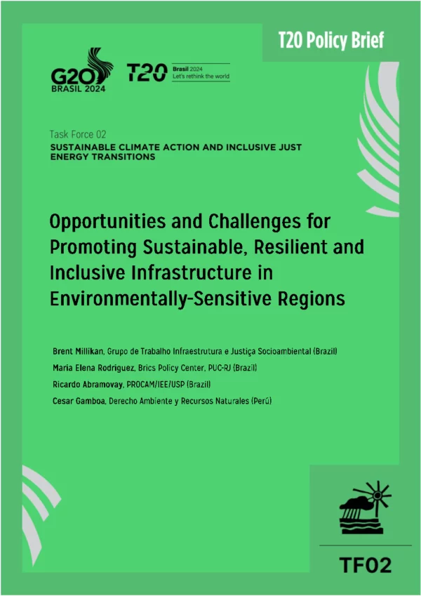 In recent decades, infrastructure investments in environmentally-sensitive regions – such as the Amazon biome, shared by nine countries – have often prioritized mega- projects – especially transportation corridors for export-oriented agribusiness and mining commodities and large hydroelectric dams with associated transmission lines. Such interventions have contributed to conversion of forests and other native vegetation and associated greenhouse gas emissions, loss of biodiversity, land conflicts and migration to urban peripheries that lack basic infrastructure services, failing to improve the quality of life of the vast majority of local populations. An alternative pathway should be based, firstly, on protecting the infrastructure of nature; as in the case of the Amazon, forests and rivers that provide ecosystem services essential for maintaining local livelihoods, as well as regional and global benefits in terms of conservation of biodiversity, regulation of hydrological cycles and climate resilience. An urgent priority is to overcome deficits in essential infrastructure for people’s well- being, especially among marginalized groups, in terms of healthcare, education, sanitation, access to energy, mobility and communications. This should include special attention to improving the quality of life in urban areas, which are increasingly vulnerable to extreme weather events intensified by climate change. Additionally, infrastructure investments in transportation, energy and communications should be reoriented towards support for economic alternatives based on the sustainable use of biodiversity, value-added supply chains, and technological innovation, prioritizing community-based initiatives and valuing traditional knowledge. We argue that national and multilateral public financial institutions can play important roles in supporting the design and implementation pathways for sustainable, resilient, and inclusive infrastructure in environmentally sensitive regions such as the Amazon, including support for upstream planning based on innovative, participatory methodologies. Similarly, foreign direct investments should be based on the guidelines of this alternative pathway.