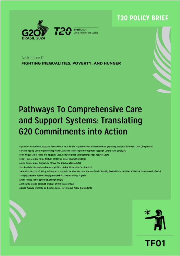 Care underpins our world, enabling individuals to lead meaningful lives and societies and economies to flourish. However, care work remains undervalued, underinvested in, and gendered. G20 leaders have recognised the centrality of care in multiple declarations over the last decade, yet underinvestment, insufficient coordination, and policy gaps persist. This policy brief outlines recommendations aimed at valuing care as a fundamental pillar for building resilient societies and achieving sustainable development by translating G20 commitments into action. These recommendations include building comprehensive care and support systems, addressing care needs to advance gender equality, guaranteeing care workers’ rights, transforming societies through quality care services, and leveraging G20 leadership to achieve these goals. Adopting these proposals will propel G20 commitments by placing care at the centre to promote human rights, shared prosperity, and gender justice. By leading this agenda, G20 countries stand to achieve a triple win: fostering thriving societies, sustainable environments, and robust economies.