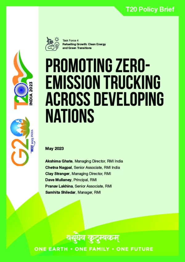 The trucking sector plays a critical role in a country’s economy. Globally, trucks account for only 4 percent of the on-road fleet but are responsible for 27 percent of greenhouse gas emissions (MacDonnell and Façanha, 2021). In developing nations, trucking demand is growing steadily, driven by the increase in economic output. Zero- emission trucks (ZETs) are a compelling alternative to diesel trucks, lowering operating costs and environmental impact. However, the nascent ZET market faces key challenges, such as the lack of demand and supply, limited infrastructure, and dearth of affordable finance and supportive policies. This policy brief highlights the strategies to fast-track ZET adoption in developing nations. It proposes formulating relevant policies and adopting ambitious targets for ZETs, underlining the need for concerted efforts towards a robust ZET supply chain. The brief also proposes ways to mobilise finance, deploy suitable charging/refuelling infrastructure, and promote research innovation and knowledge exchange to foster the ZET ecosystem in the G20 countries and the developing world.