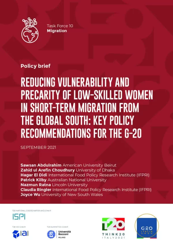 Proactively focusing on precarious migration of women from the Global South to destination countries to provide much needed domestic and care work is a growing challenge in a post-COVID-19 world. The G20 is called to provide a leadership role in reducing risk and vulnerability of women migrants, which have been magnified as a result of COVID-19 and will likely remain a key challenge during 2022 and beyond and also contributes to global gender inequality which has been compounded by the pandemic We propose the following policy actions for uptake by G-20 countries: