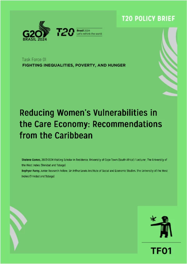 Our policy brief highlights potential areas for policy making to reduce women’s vulnerabilities in the G20 countries. Drawing from empirical quantitative and qualitative research into social care, migration, and violence against women and girls, we present prospects for enhancing social equality and equity in the care economy. Focussing on the care of older persons, these macro- and micro-level studies yielded insights into the circumstances of providing care and the policy gaps. We present scenarios from the multicultural Caribbean where there is a high reliance on family and community care within a migration context to illustrate the wider consequences of undervaluing care work. While care providers typically come from within families, this practice increases the burden on women. Our recommendations include implementing flexible work hours in the public sector for professional women with care responsibilities; and the strengthening of social protections in the form of care grants for older persons with immigrant relatives.