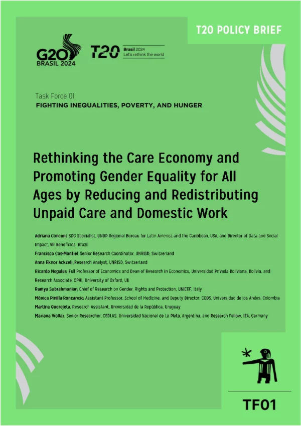 Unpaid care and domestic work (UCDW), involving providing direct and indirect care to family members without remuneration, is crucial for human and productive functioning. Care work is intrinsically gendered: globally, women perform 76.2% of unpaid care work, 3.2 times more than men, affecting their education, employment, wages, and leadership opportunities. Care work is also generational: globally, girls aged 5-14 spend 550 million hours daily on household chores, 41% more than boys. Around the world, gender inequalities in care work start early, widening inequalities between girls and boys in schooling, age at marriage, and less well-explored impacts on self-esteem, empowerment, and confidence. The COVID-19 pandemic highlighted the importance of care work and the need for reforms to alleviate women’s care responsibilities. Providing appropriate care services, including policies aimed at equality in the workplace, investment in quality public social infrastructure, and valuing unpaid work, are instrumental for reducing care burden. However, these efforts may not sufficiently address the unequal distribution of unpaid care within households by gender. Redistributive policies addressing these imbalances are vital, beginning with interventions in early adolescence. G20 countries need to address fundamental gender inequalities that are constraining their full economic and social potential by considering the importance of both investing in care services and the workforce, as well as addressing unequal gender norms and unequal distribution of UCDW from early adolescence.