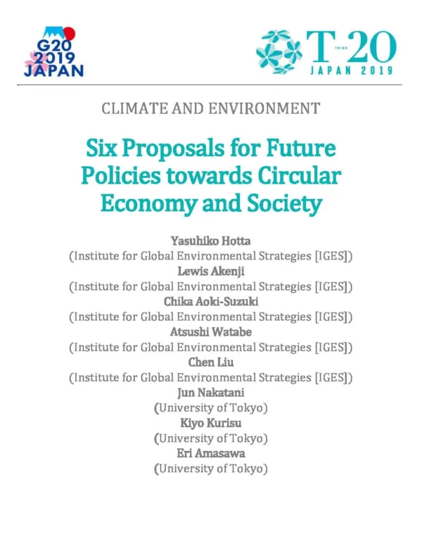This policy brief suggests six priorities for developed and emerging economies represented by G20 countries to mainstream circular economy and society globally, as follows: 1) need to capture the momentum raised by public attention on marine plastic pollution; 2) raise the level of ambition of Extended Producer Responsibility; 3) provide policy support for circular economy business models; 4) promote regional circulating and ecological spheres to enhance bottom-up initiatives at local level; 5) enhance international policy coordination and harmonisation for circular economy and society; and 6) incorporate planetary boundaries into the indicators of circular economy and society. It includes suggestions of further tasks for countries where these policies are already in place.