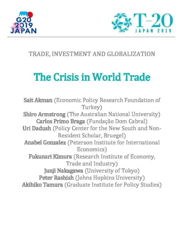 This policy brief (PB) provides decision-makers with a succinct review of the state of the trading system, to point to likely scenarios, and to serve as a background to or reference for the other six PBs prepared by the T20 Task Force on Trade, Investment and Globalization. The brief argues that the world trading system has been remarkably successful in many respects but that the present strain reflects causes which are deep-seated and require a strategic response. The future of the system depends critically on reinvigorating the WTO and policy change in the largest trading nations. Important measures are required to sustain the multilateral trading system, and urgent action is needed to avoid a scenario where the system fragments. The worst scenarios will disrupt global trade and see a world which splinters into large trading blocs (most likely centered around China, the European Union and the United States) and where trade relations are based to a large extent on relative power instead of rules. In such a world the smallest players – especially those whose trade is least covered by bilateral or regional agreements – will be at the greatest disadvantage. All countries will incur enormous costs only to try and reinvent a system that is already in place today under the WTO.
