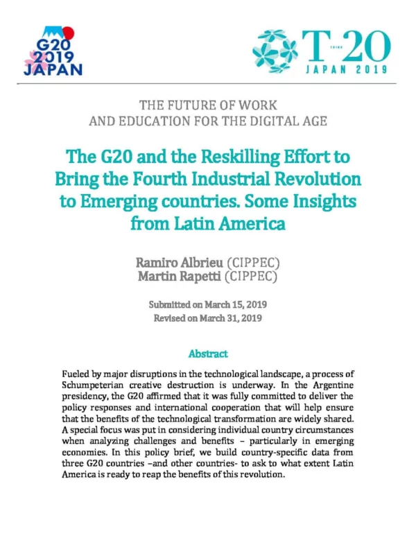 Fueled by major disruptions in the technological landscape, a process of Schumpeterian creative destruction is underway. In the Argentine presidency, the G20 affirmed that it was fully committed to deliver the policy responses and international cooperation that will help ensure that the benefits of the technological transformation are widely shared. A special focus was put in considering individual country circumstances when analyzing challenges and benefits – particularly in emerging economies. In this policy brief, we build country-specific data from three G20 countries –and other countries- to ask to what extent Latin America is ready to reap the benefits of this revolution.