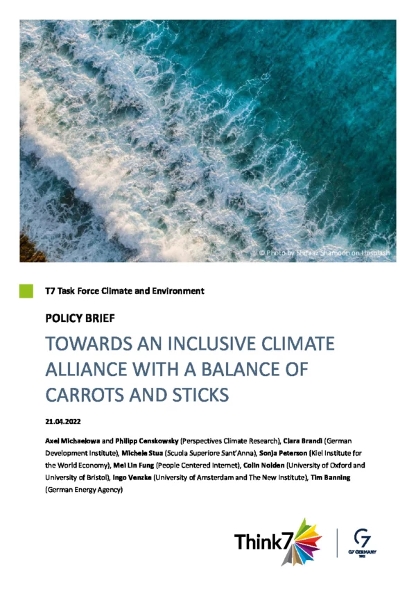 As G7 countries generate 25% of world greenhouse gas emissions, an open and cooperative G7 climate alliance can accelerate international climate policy in a transformative and inclusive manner. Building upon a proposal of the German Government (2021), we propose the following design elements for such an alliance:
