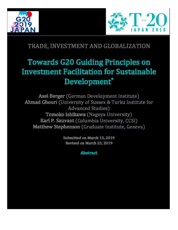 There is growing support behind an international framework to facilitate Investment for sustainable development. This Policy Brief suggests that the G20 consider adopting Guiding Principles on Investment Facilitation for Sustainable Development, to help ensure that these efforts result in an effective, coherent, and developmentoriented outcome. To this end, this Brief proposes guiding principles to: (1) orient investment facilitation, (2) facilitate sustainable FDI, (3) integrate facilitation throughout the investment lifecycle, (4) engage in multistakeholder consultations, (5) ensure shared responsibilities, (6) encourage cooperative activities, (7) adopt a whole-of-government approach, (8) focus on national efforts within a multilateral framework, and (9) support capacity building coupled with flexibility.