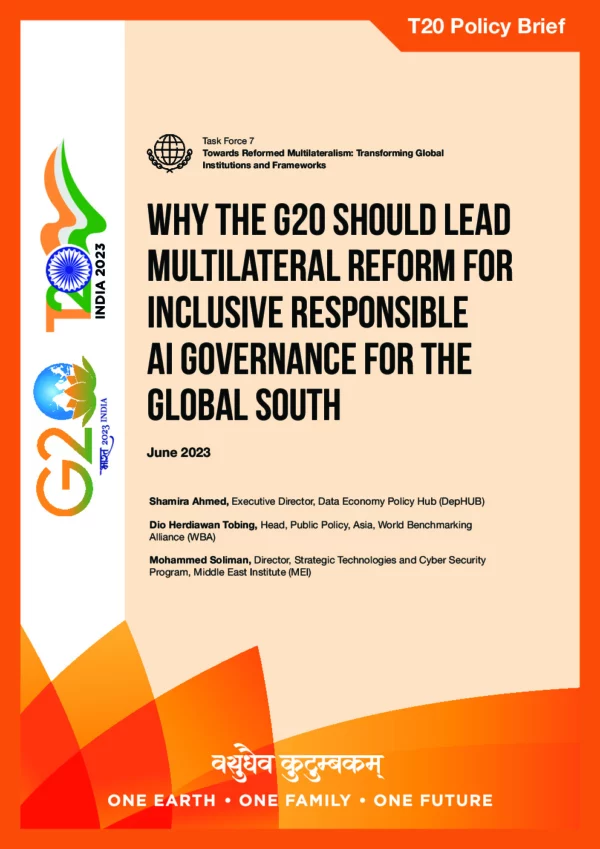 Artificial intelligence (AI) creates unique challenges for the Global South. While AI presents opportunities for ‘leapfrogging’, it can also result in considerable adverse externalities if it is developed and deployed irresponsibly. Despite being more susceptible to the negative impacts of AI, current global AI governance initiatives do not reflect Global South realities. Multilateral reform for global AI governance is urgently needed to facilitate a transversal, mission-oriented approach that incorporates multiple stakeholders and ensures the legitimacy of international cooperation. This will help guarantee that systemic consolidation of power and control is addressed, digital dividends are distributed more equitably, and existential AI risks are mitigated to suit the various socioeconomic realities of both the Global South and Global North. This policy brief recommends that the G20 lead efforts to reflect our interdependent, culturally diverse, and modern society by amplifying participation of the Global South in the development of global AI governance.